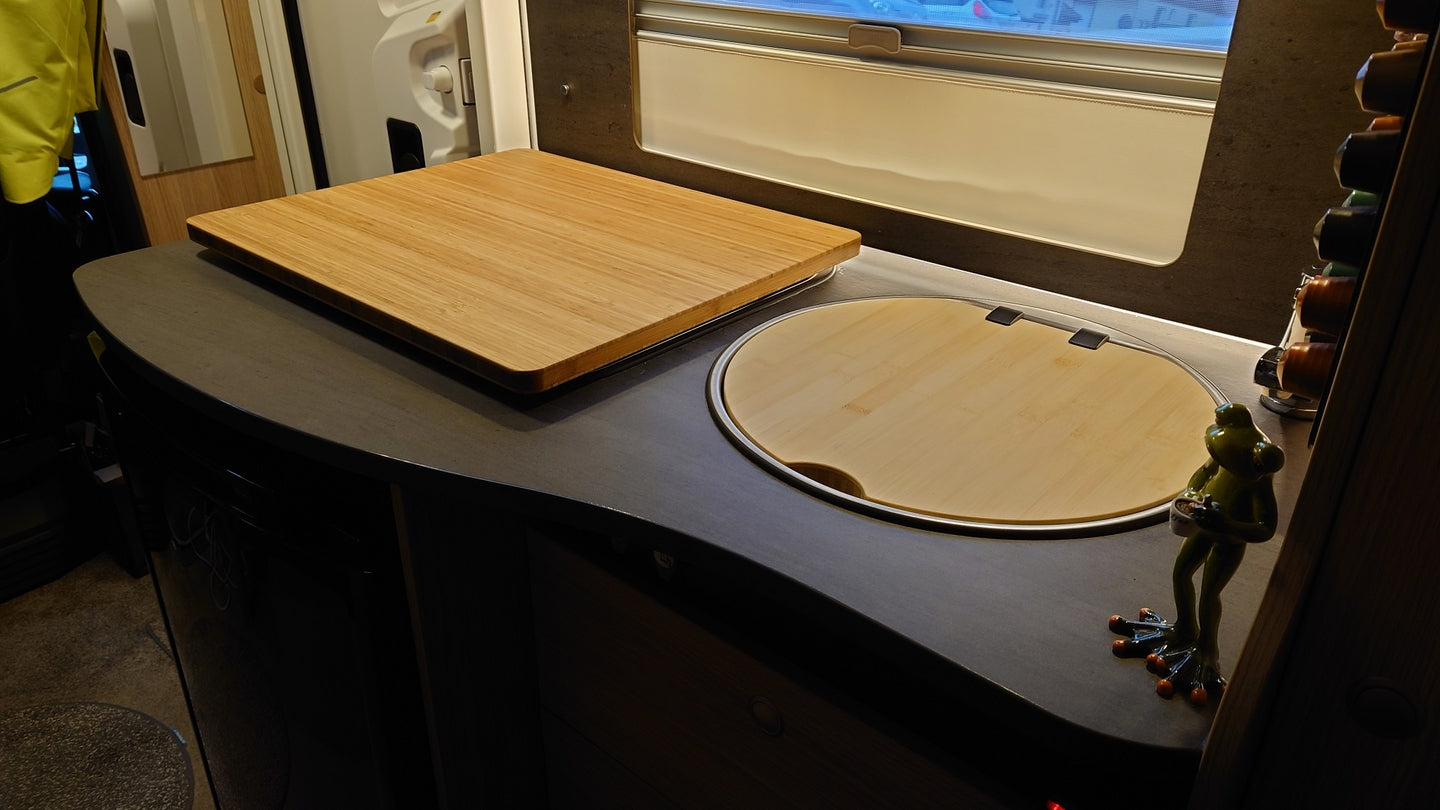Notre couvercle d'évier pour camping-cars est fabriqué en Allemagne à partir de bambou durable et marque des points grâce à sa fonction pratique 2 en 1. Il sert également de planche à découper et peut être facilement retiré grâce à l'encoche. Pendant le trajet, tu peux ranger les ustensiles de cuisine sous le cache-évier.