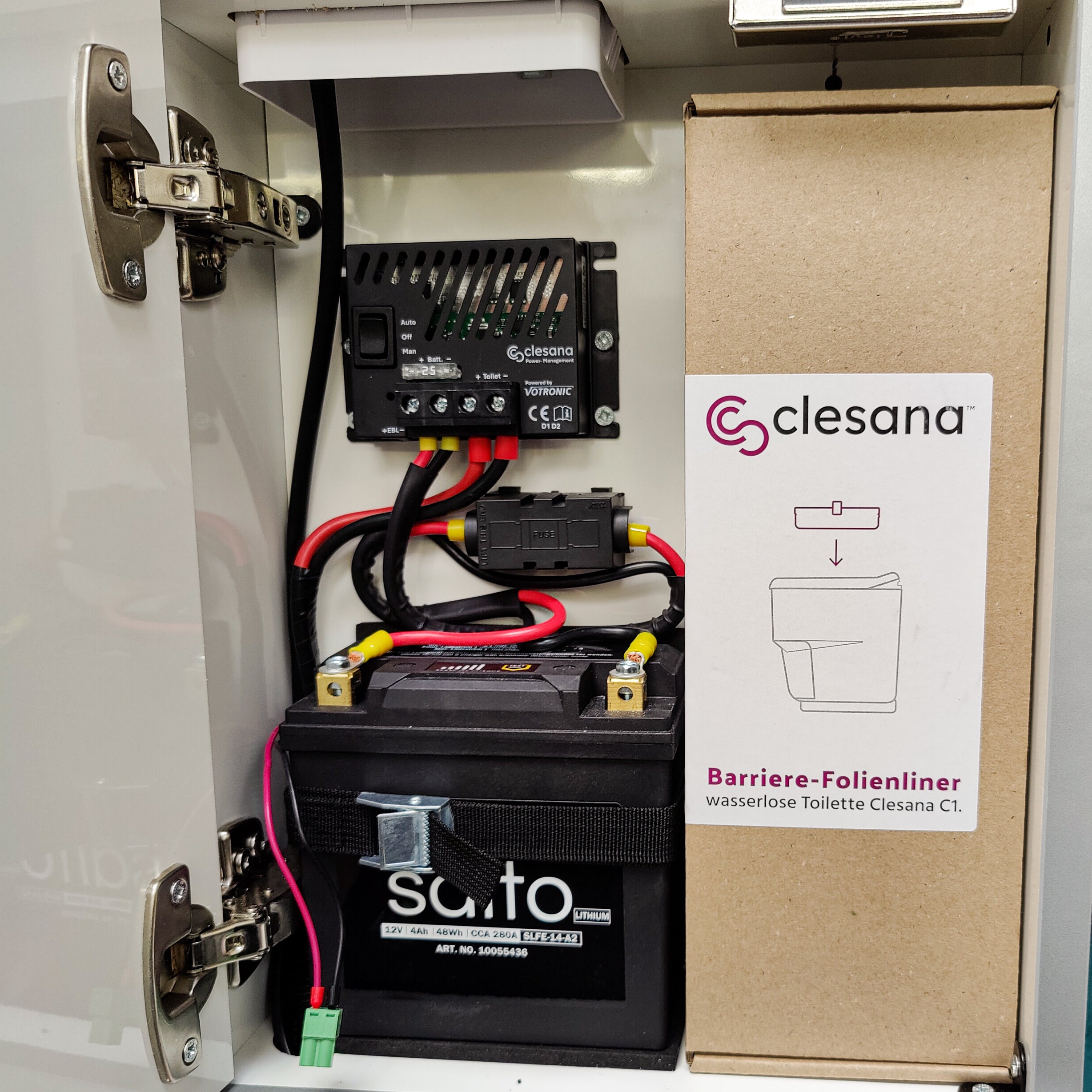 Le système de gestion de l'énergie Clesana combine les fonctions d'un relais et d'un chargeur DC/DC pour une plus grande autonomie. Il est relié à une batterie d'appoint qui libère le flux de courant lorsque les toilettes sont utilisées. Lorsque le Clesana est en veille, la batterie d'appoint est chargée avec un courant de charge de 2A via la gestion de l'énergie. La commande s'effectue via un câble 12V positif permanent. Même en cas de panne de la batterie de bord, le Clesana C1 peut encore être alimenté par la batterie d'appoint. Nous pouvons installer le système de gestion de l'énergie, y compris tous les raccordements. Nous avons formé notre menuisier Thorsten à cet effet.