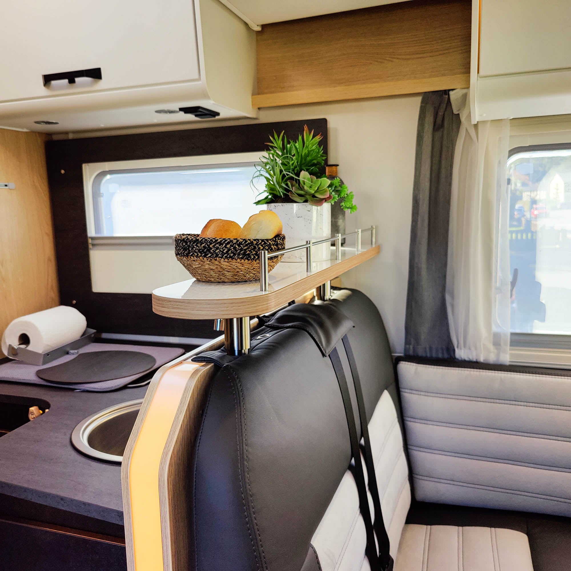 Notre planche de rangement au lieu des appuie-têtes dans ton camping-car