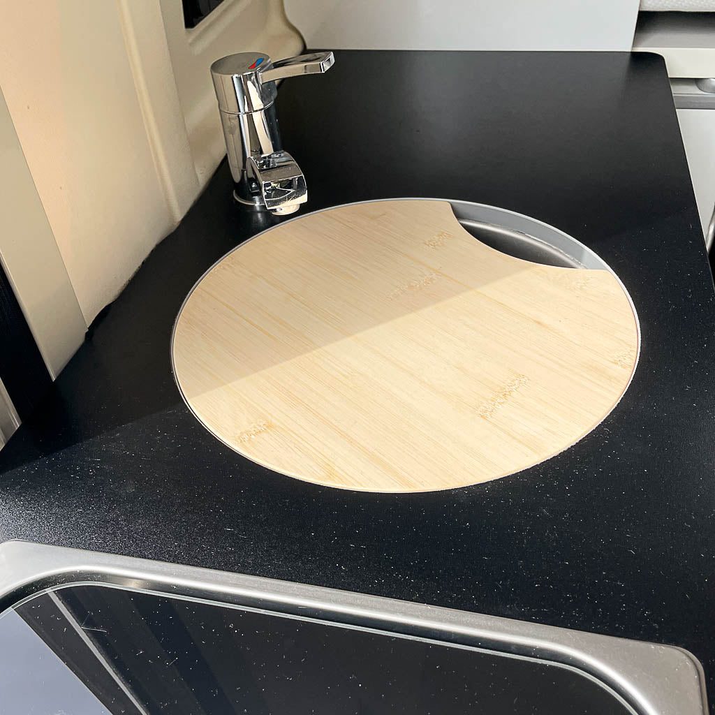 Notre planche à découper en bambou pour l'évier de ton camping-car