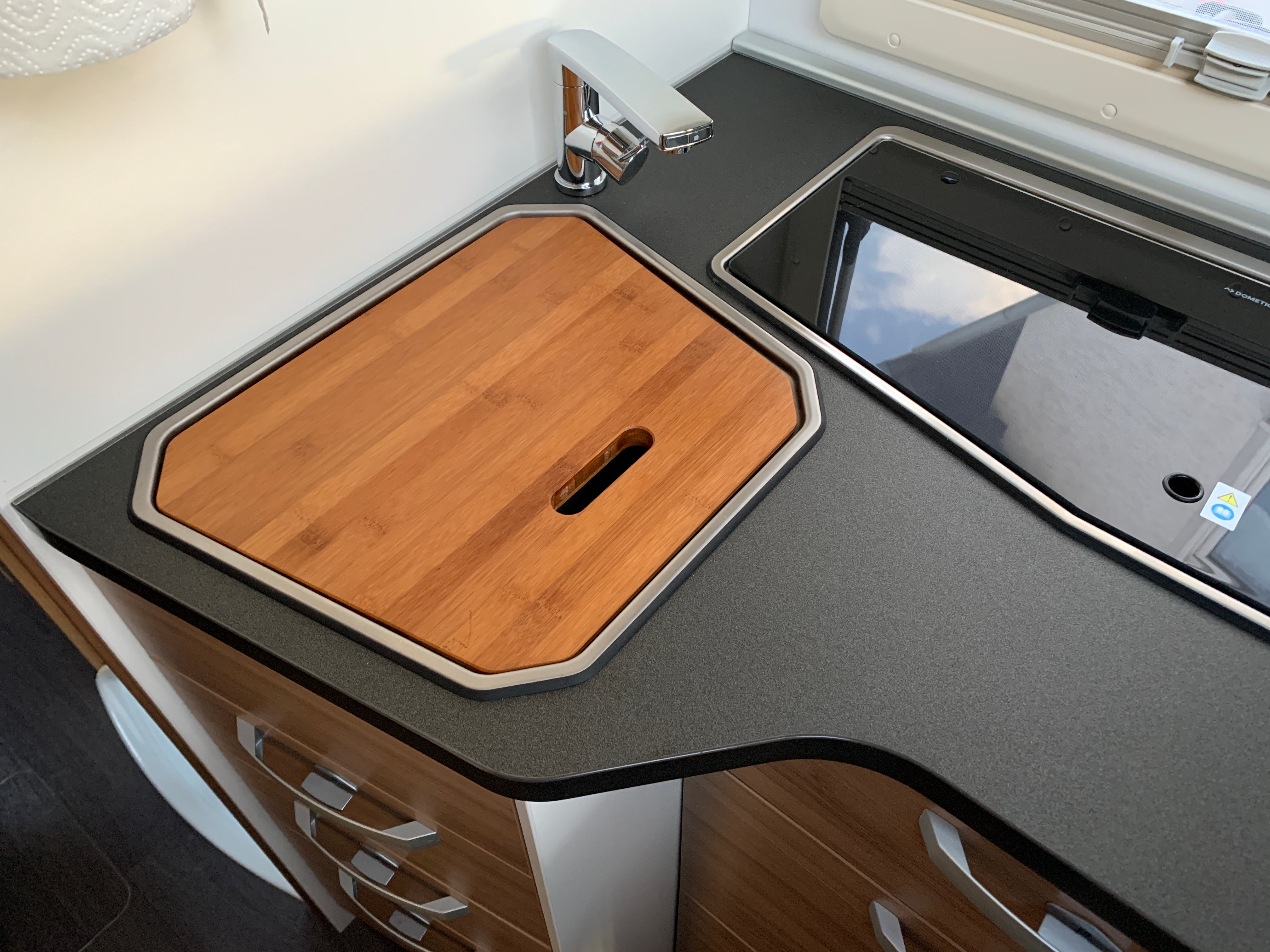 Notre planche à découper en bambou pour l'évier de ton camping-car